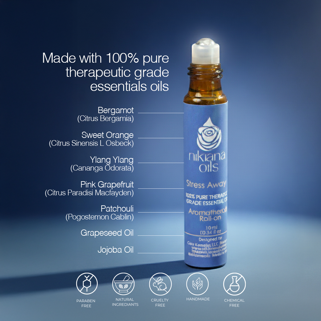 Our Stress Away synergy blend features many benefits, such as helping you fill your day with positivity or creating a blissful, tranquil ambience is a natural way to decrease stress and support for general well-being.
